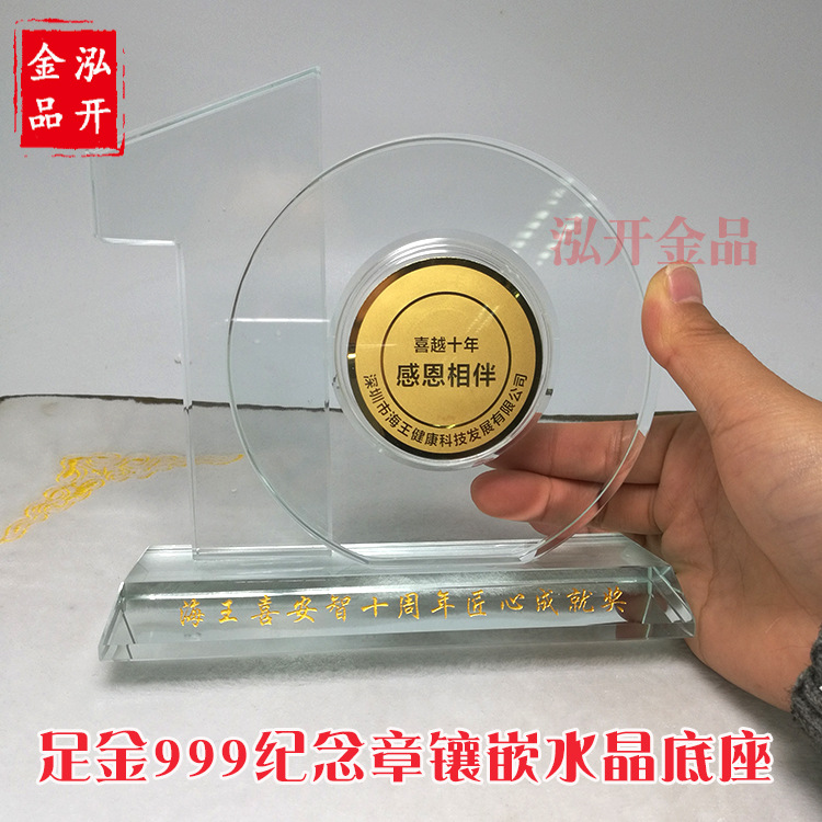 水晶奖杯定制 镶嵌纯金银纪念币礼品 公司年会颁奖周年庆礼...