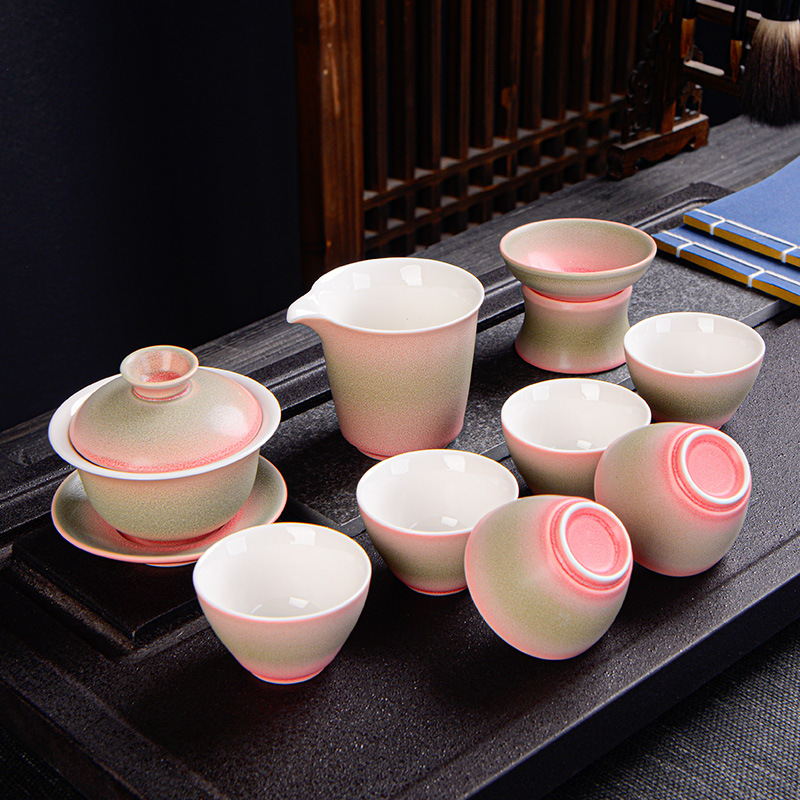 渐变粉色功夫茶具套装 会销活动三才盖碗 陶瓷礼品批发定制