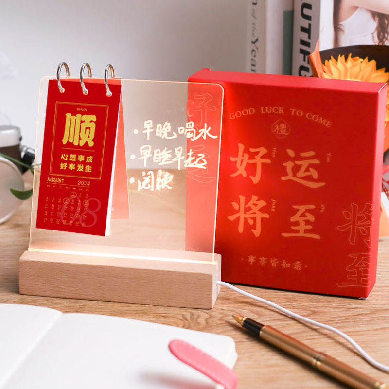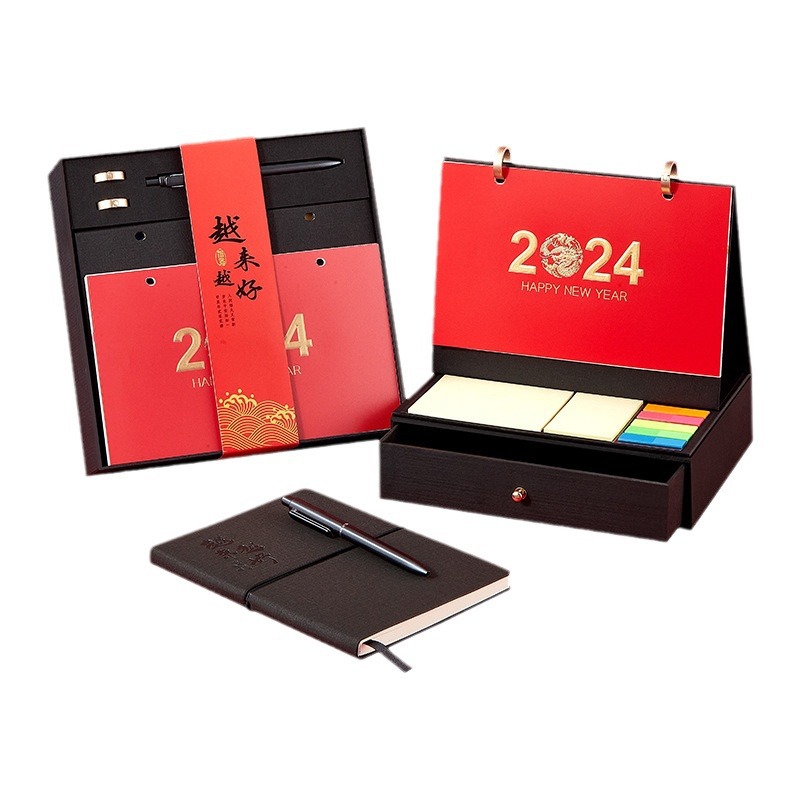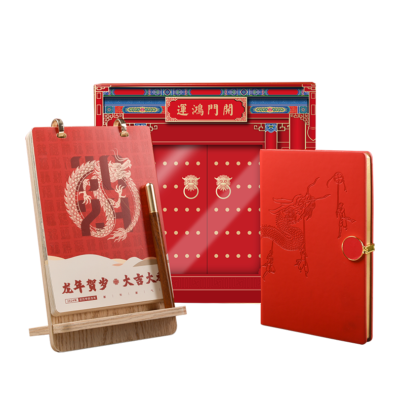 配置:①龙年新春台历、②知书·红木笔、 ③“长红”笔记本...