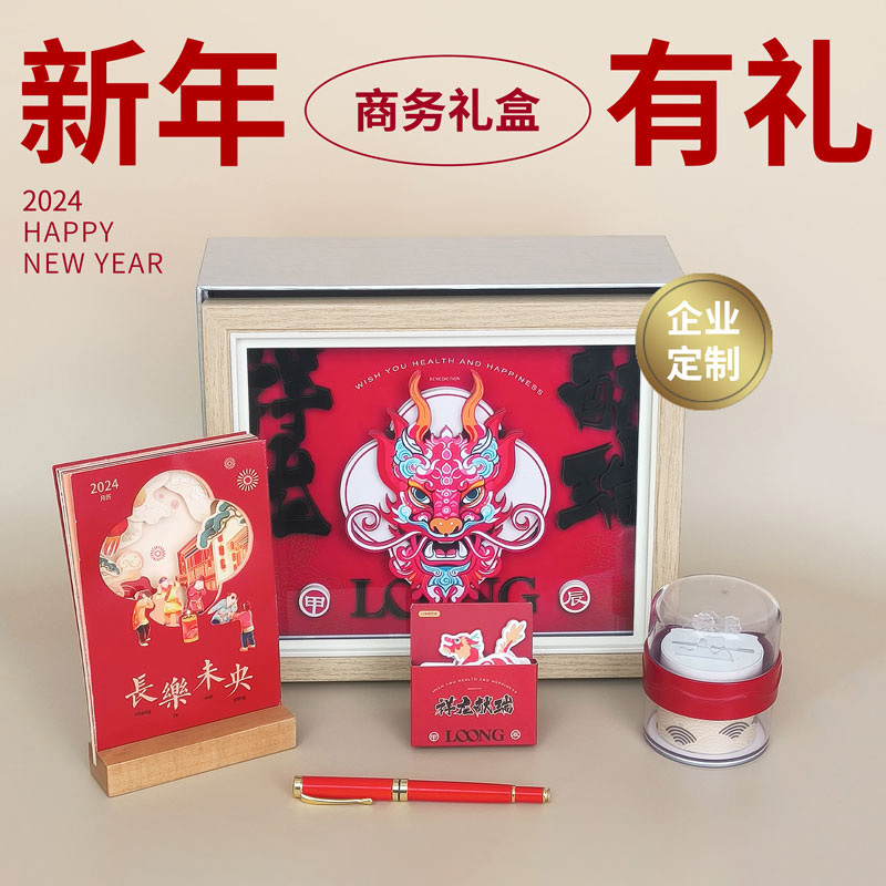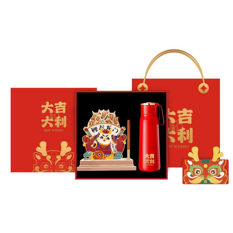 配置:笔记本、钢笔、书签、保温杯、新春摆件