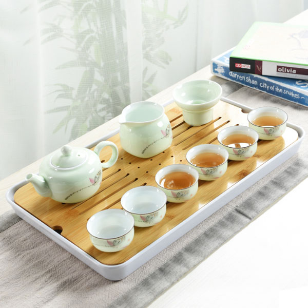 翡翠青瓷骨质瓷茶具 密胺茶盘整套礼盒包装送礼佳选