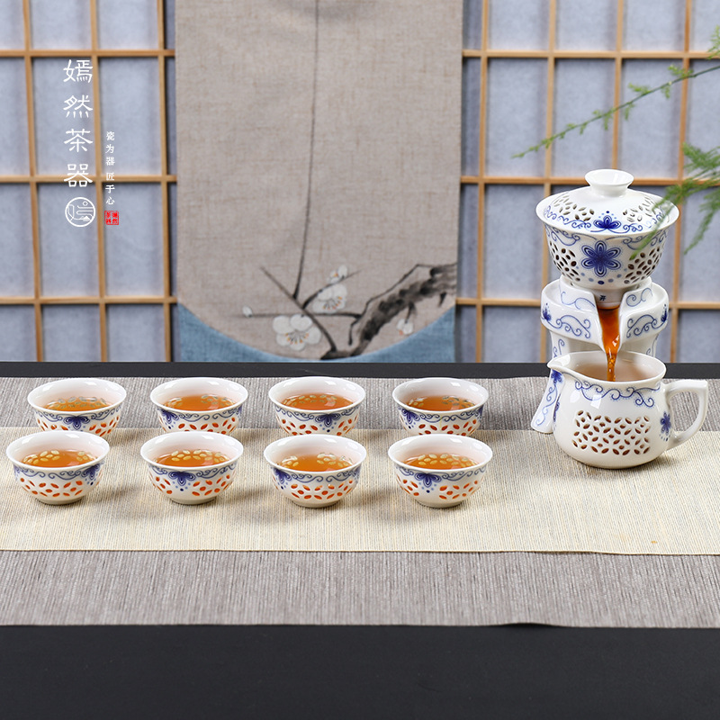 玲珑镂空石磨茶具礼品定制 自动泡茶具套装白瓷茶具