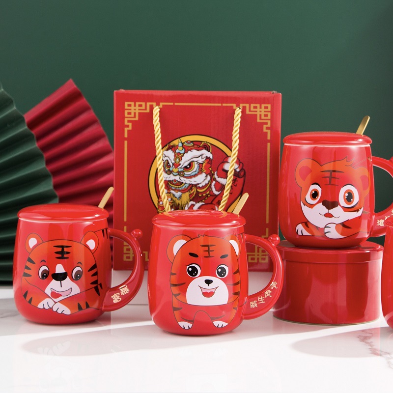 虎年中国风红色陶瓷马克杯 新年礼品杯子礼盒套装 可爱卡通...