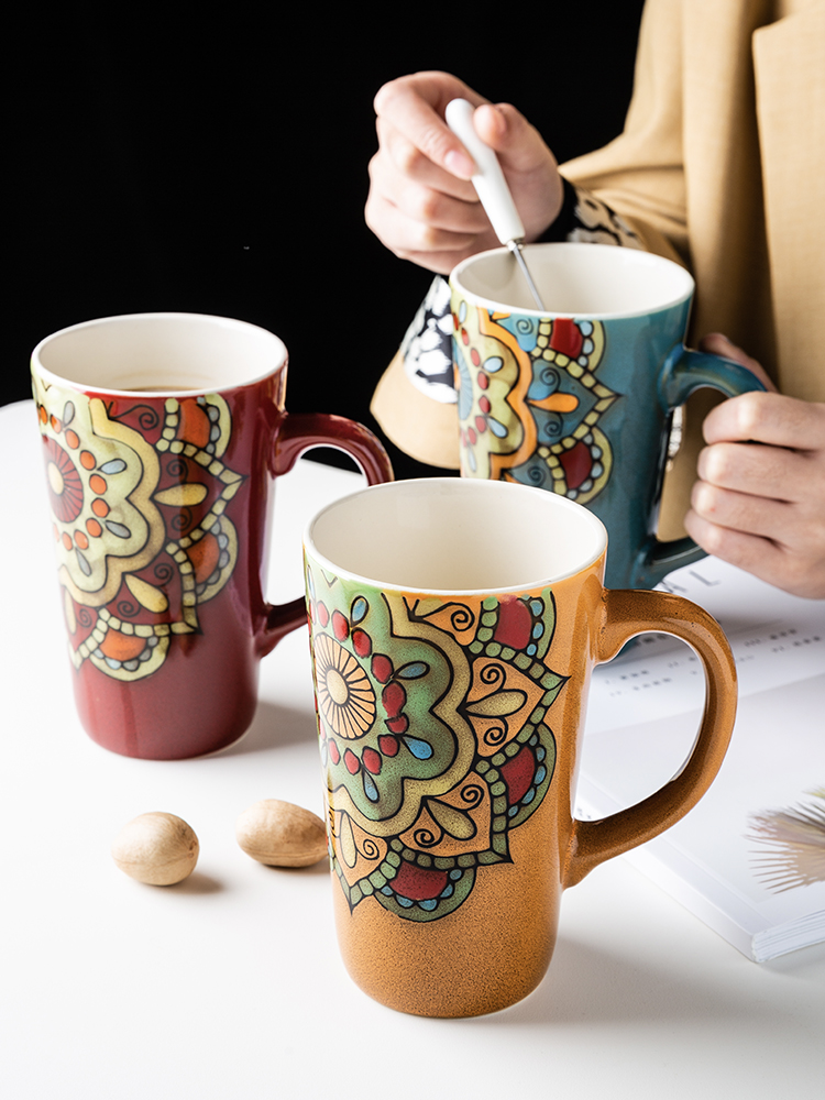 马克杯大容量陶瓷杯子带盖勺复古风手绘咖啡杯女办公室家用喝...