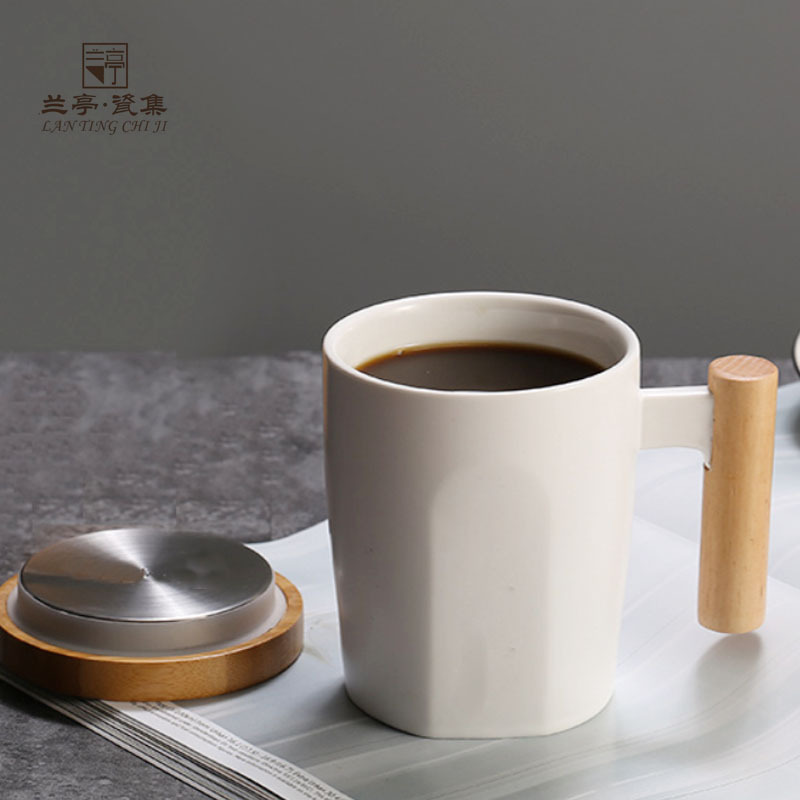 创意杯子陶瓷马克杯木柄咖啡杯办公室水杯带盖黑白情侣杯商务...