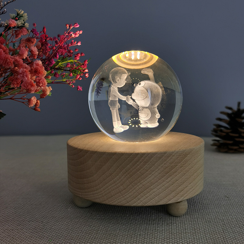 哆啦A梦水晶球旋转音乐盒 生日礼物小夜灯 蓝牙音响榉木底...